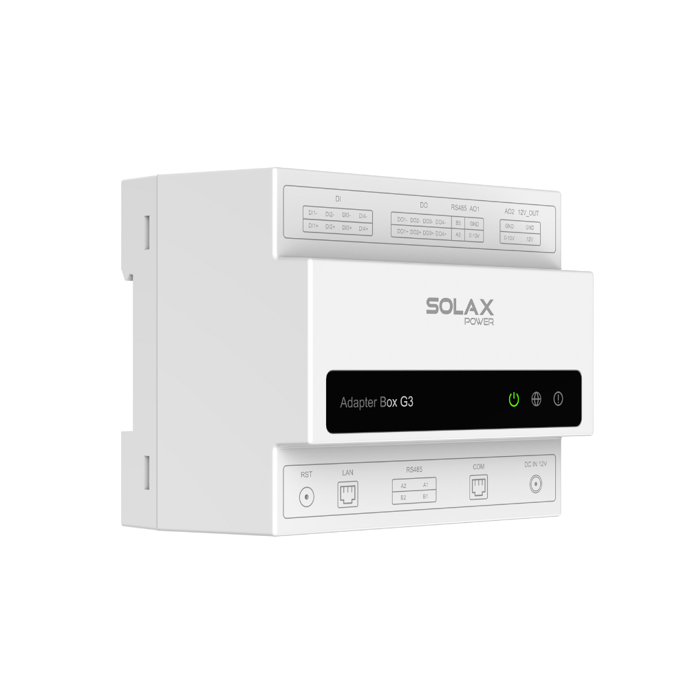 The SolaX Adapter BoX G3 is a compact smart load manager with DIN rail design for easy installation. It supports WiFi and LAN connectivity, external control access, and a clean layout suited for use.